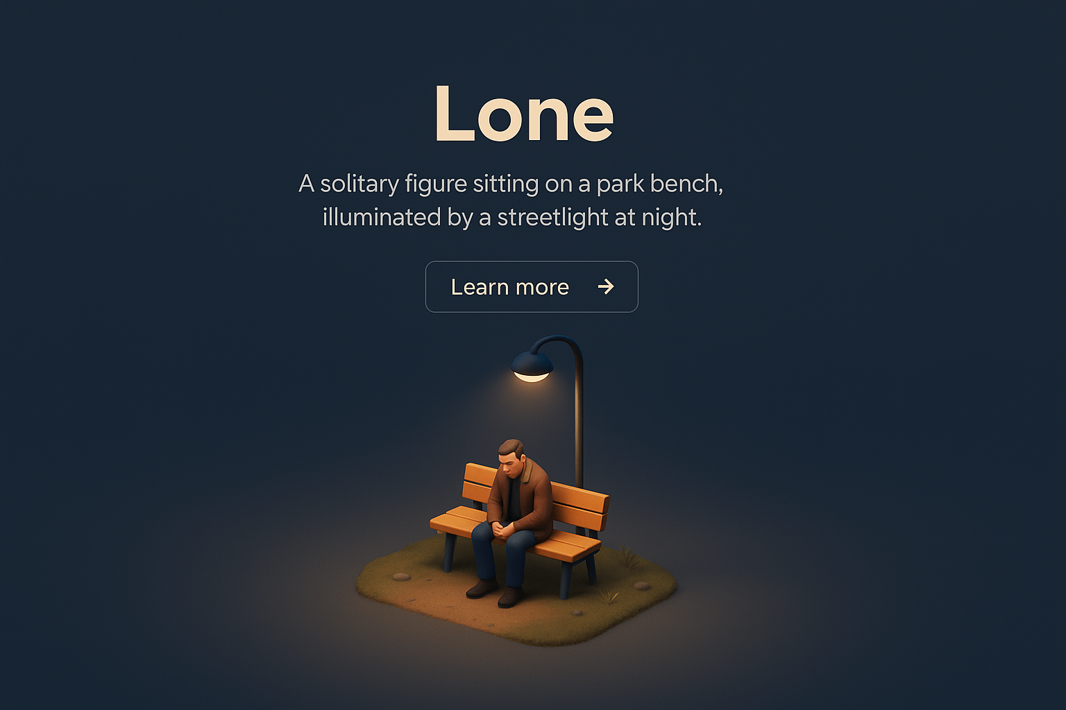 A realistic 3D scene featuring a solitary figure sitting on a park bench under a streetlight at night. The dark background enhances the mood of solitude.