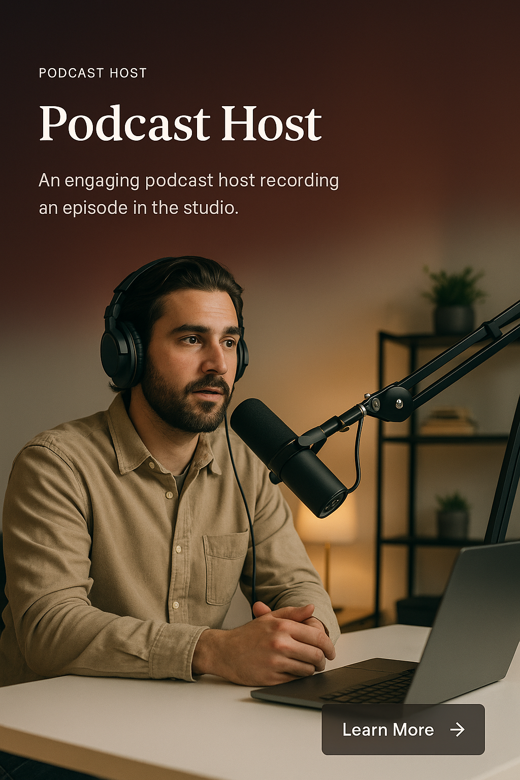 /Collection: /by davooda/Type: PNG/A stylish web page design featuring a podcast host recording an episode in a studio. Includes a gradient background, engaging text, and a call-to-action button.