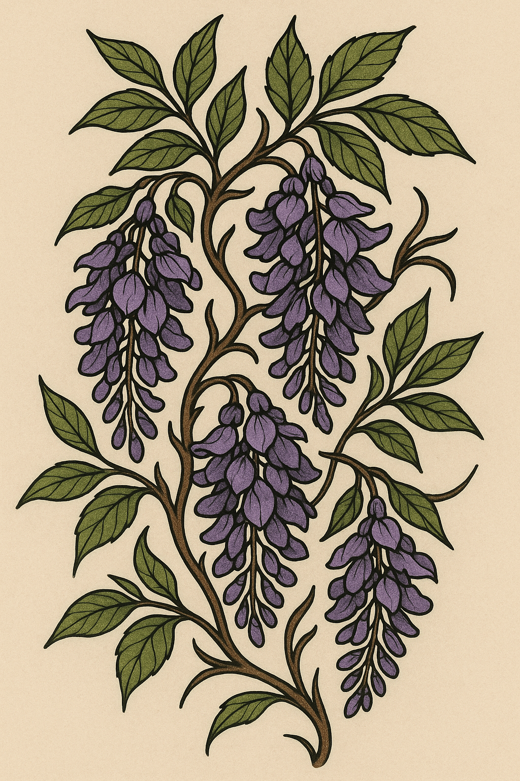 /Collection: /by davooda/Type: PNG/This image features a detailed botanical illustration of wisteria flowers and leaves, showcasing intricate line work and a pastel color palette. Ideal for nature-themed projects.