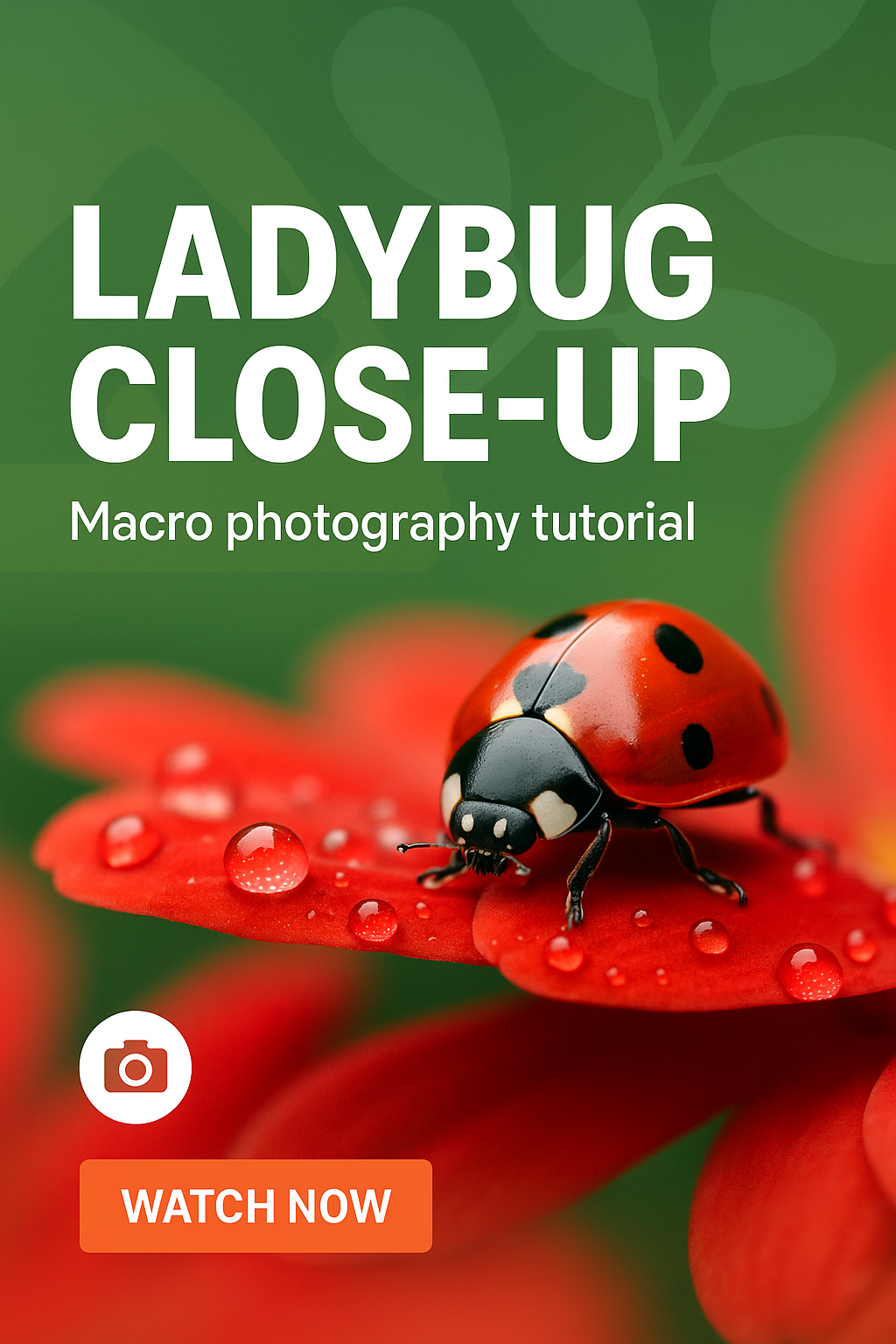 Engaging macro photography tutorial graphic showcasing a close-up of a ladybug on a flower, ideal for nature enthusiasts and photography learners.