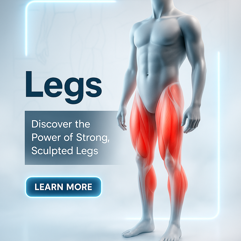 Detailed anatomical graphic showcasing leg muscles with highlighted areas, designed for fitness or educational purposes. Ideal for promoting strength training programs.