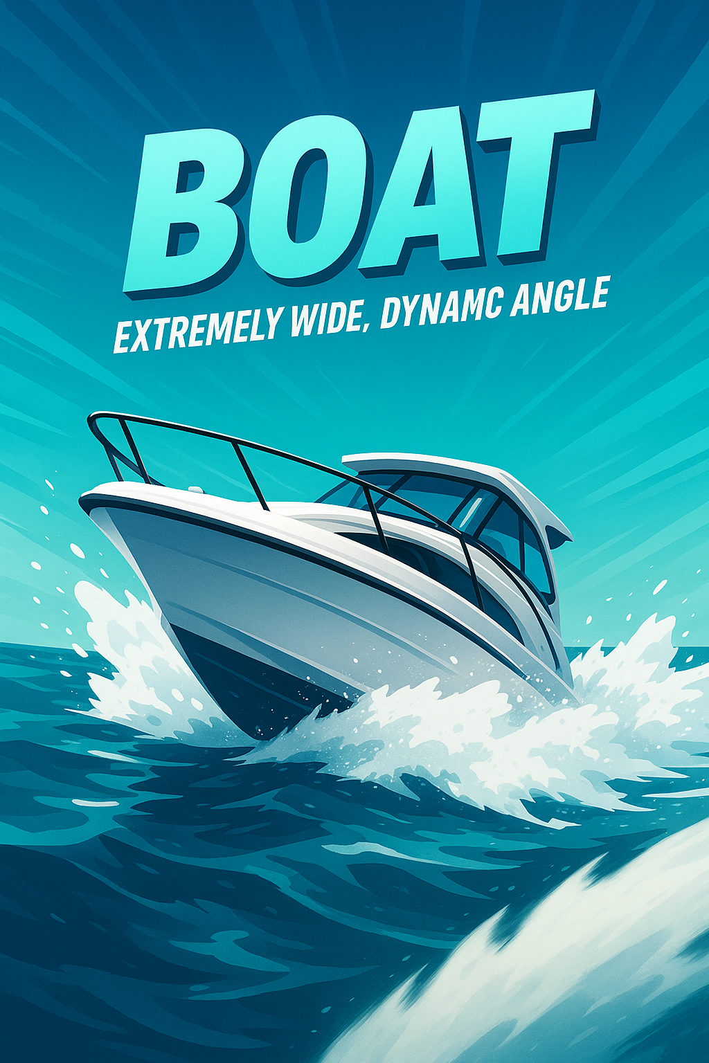 /Collection: /by davooda/Type: PNG/A visually striking illustration of a boat captured from an extremely wide and dynamic angle, showcasing splashes of water and vibrant colors. The design emphasizes motion and energy.