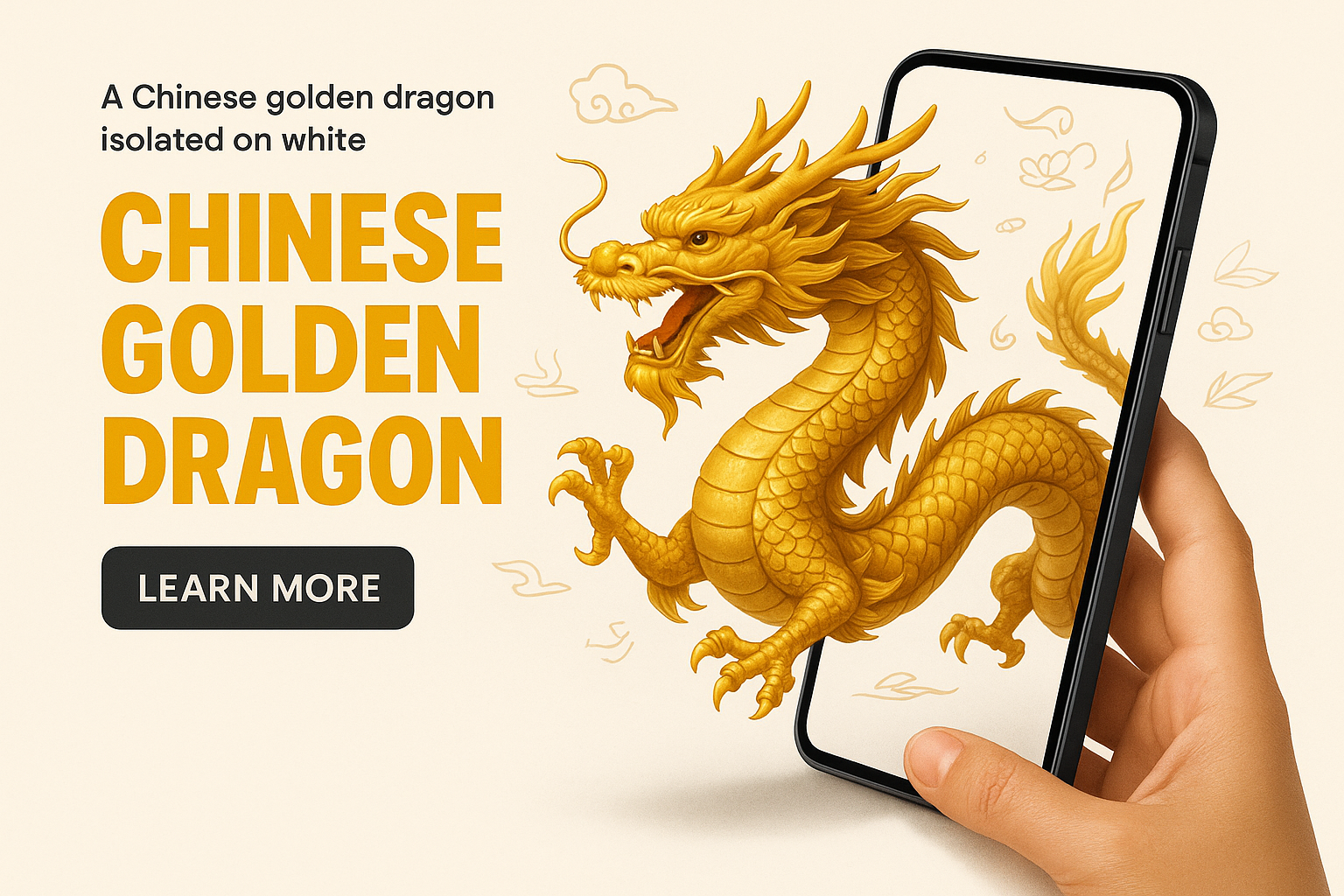 /Collection: /by davooda/Type: PNG/A stunning golden Chinese dragon appears to emerge from a smartphone screen, surrounded by playful typography. The design features bold colors and a modern layout.