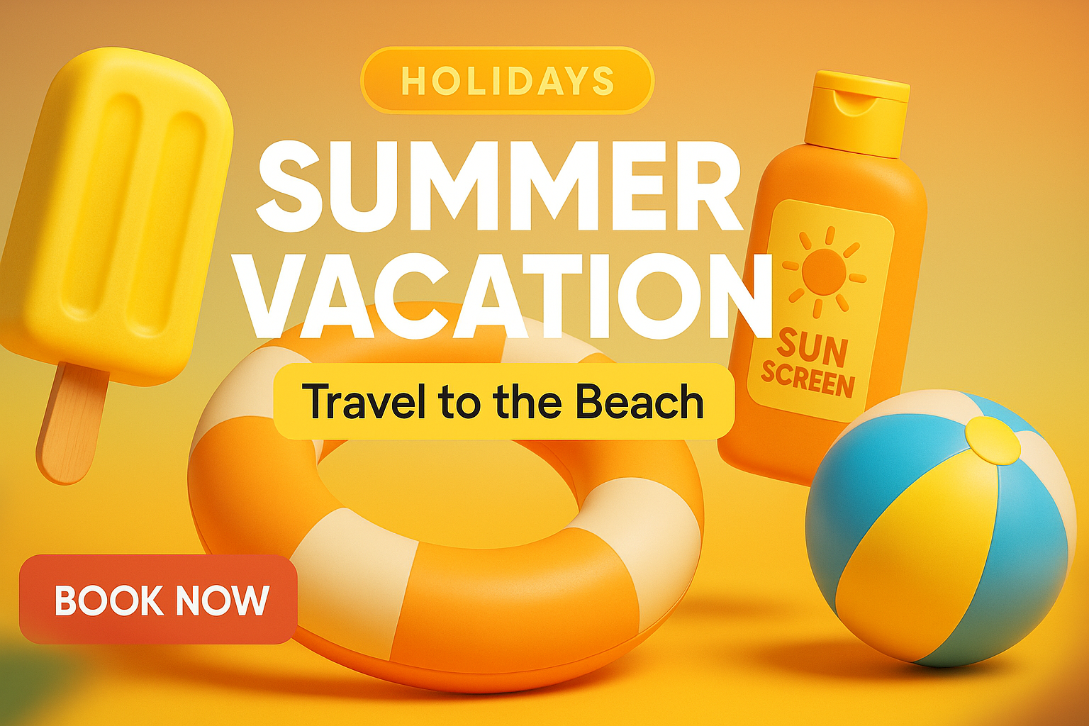 Colorful promotional graphic featuring beach-themed items like sunscreen, a beach ball, and a lifebuoy, designed to attract travelers for summer vacations.