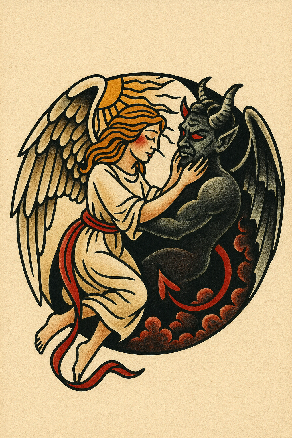 /Collection: /by davooda/Type: PNG/A vibrant tattoo sketch depicting an angel with wings and a demon. The angel is shown in soft colors while the demon is dark, set against a light beige background.