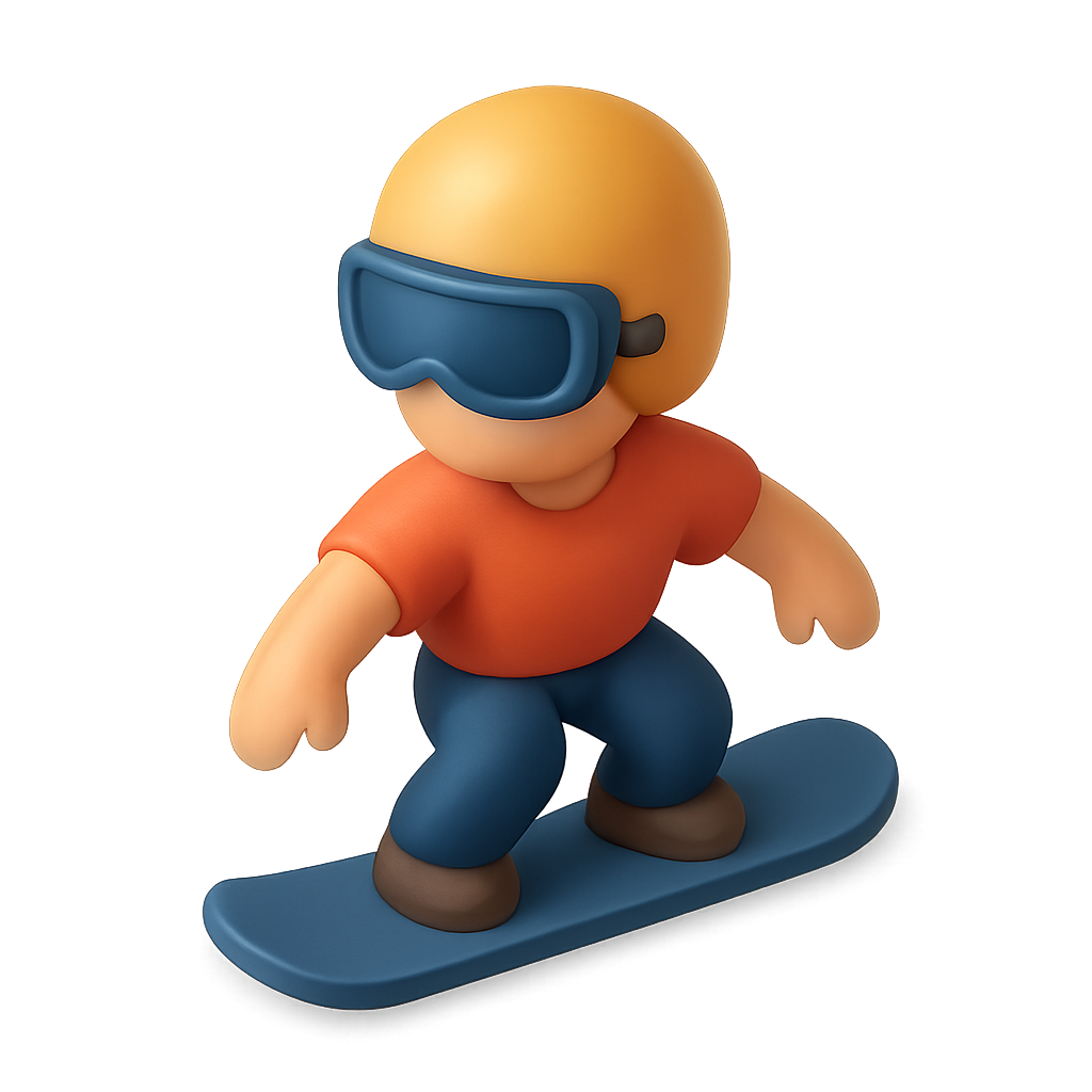 A vibrant 3D icon of a snowboarder in a three-quarter view, featuring a character with a yellow helmet, blue goggles, and a bright red shirt, riding a blue snowboard.