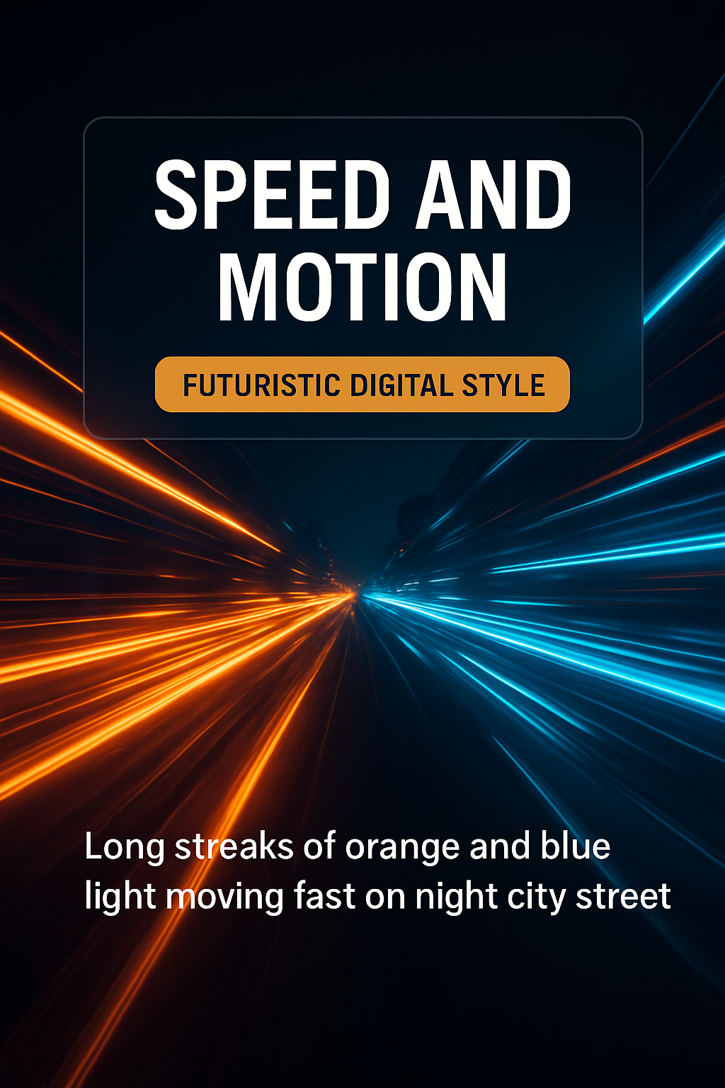/Collection: /by davooda/Type: PNG/This image showcases a futuristic digital design with streaks of orange and blue light, symbolizing speed and motion in a night city setting. Ideal for tech or automotive themes.