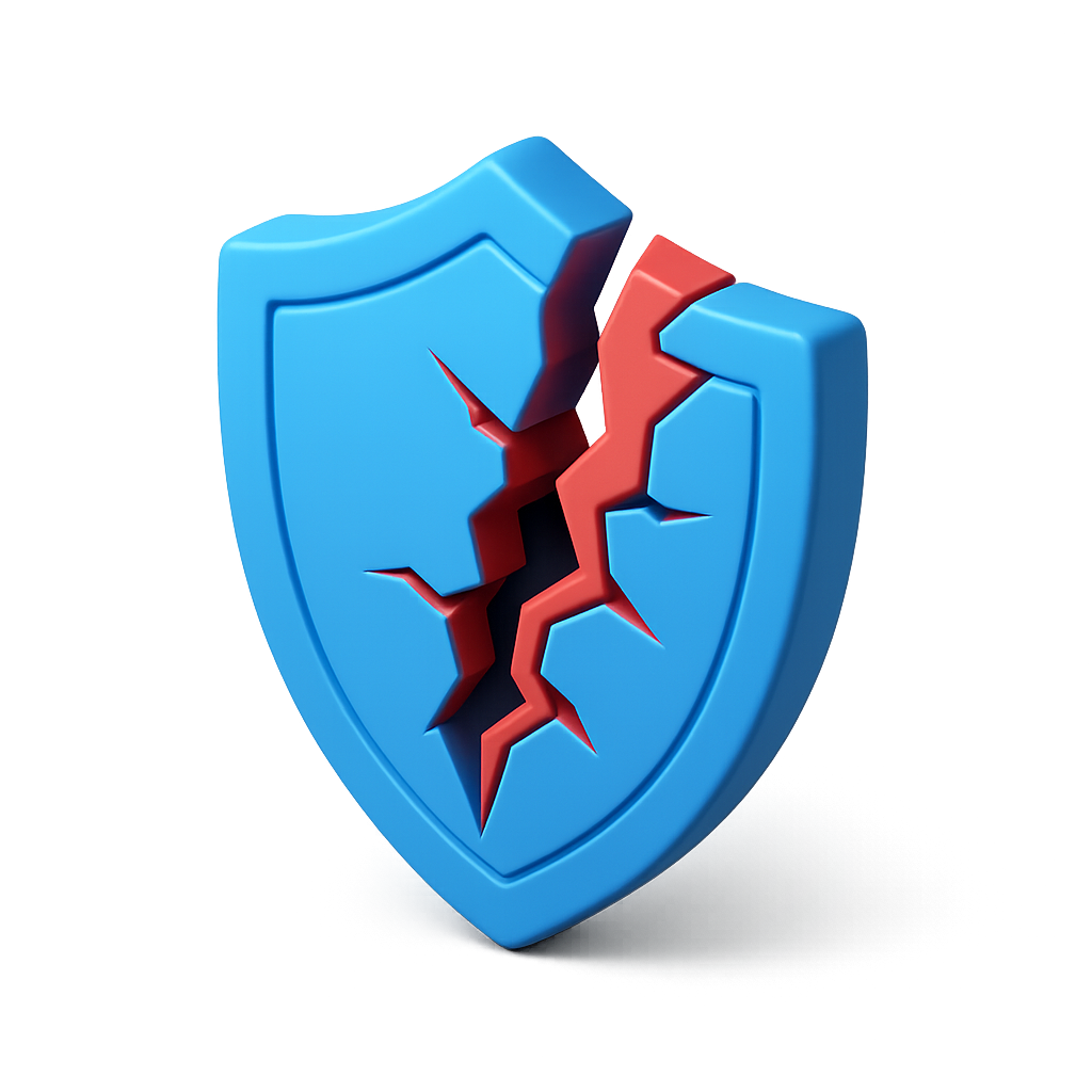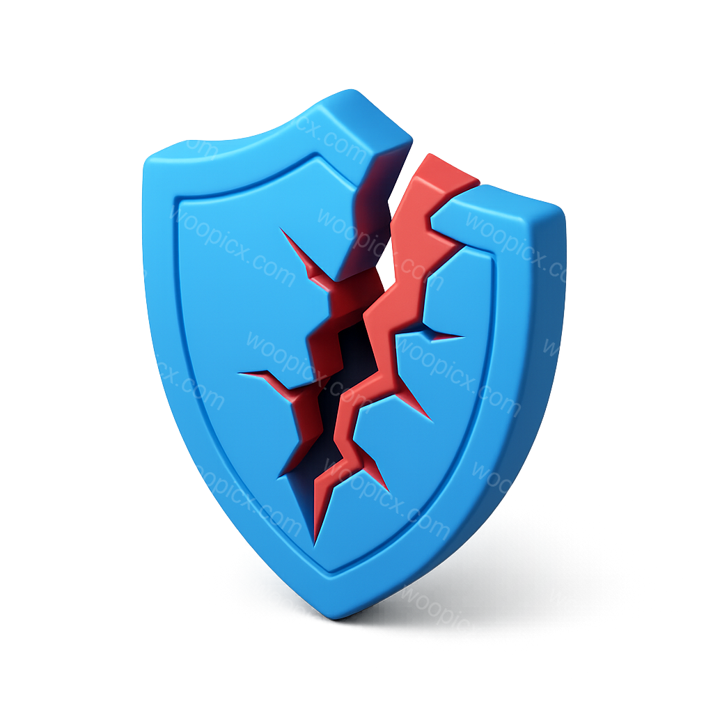 A visually striking 3D icon depicting a blue shield with a prominent crack, symbolizing a breach. The design features a three-quarter view and a glossy finish, enhancing its volumetric appearance.