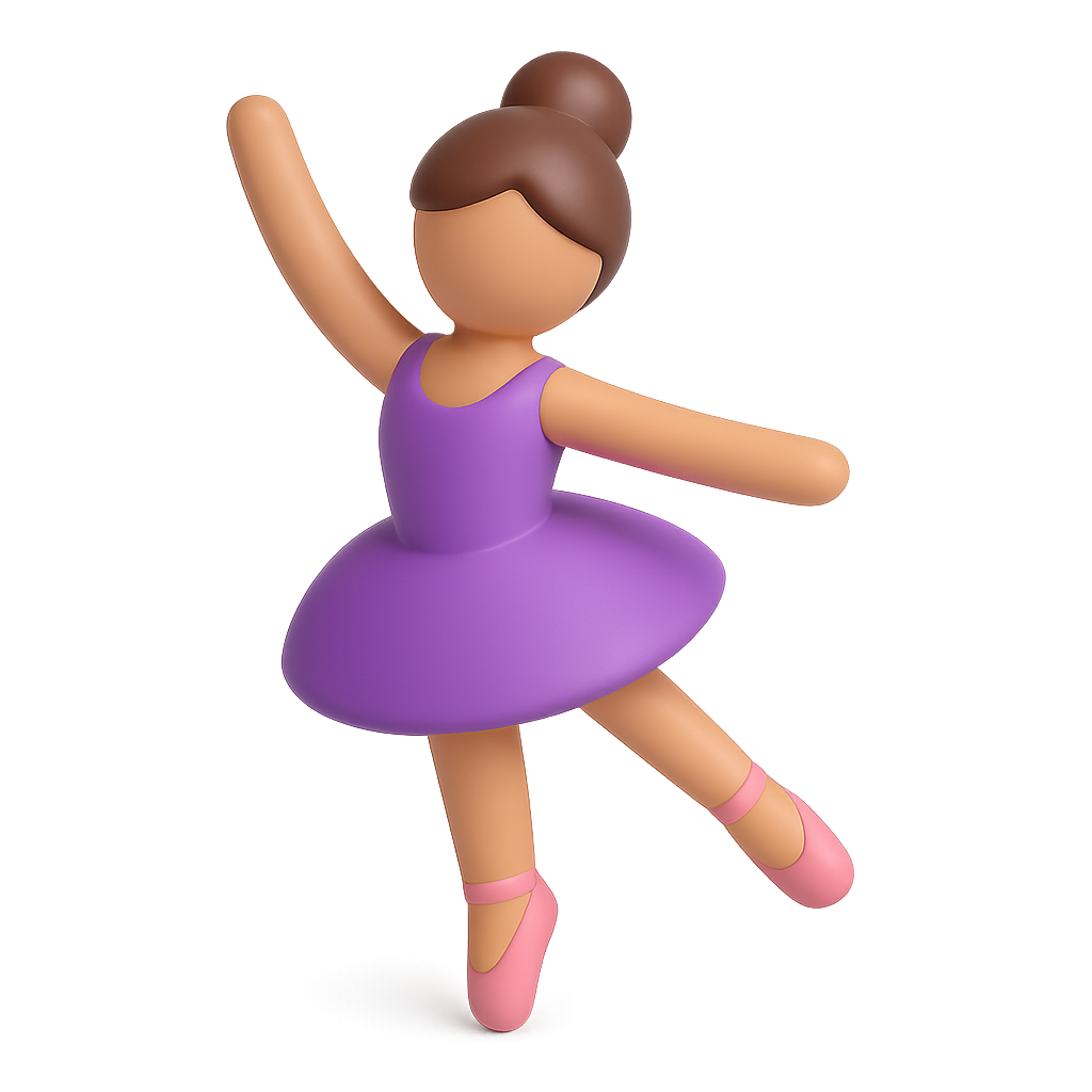 A vibrant 3D icon of a ballet dancer in a purple tutu and pink ballet shoes, set against a soft gradient background, showcasing an isometric and volumetric design.