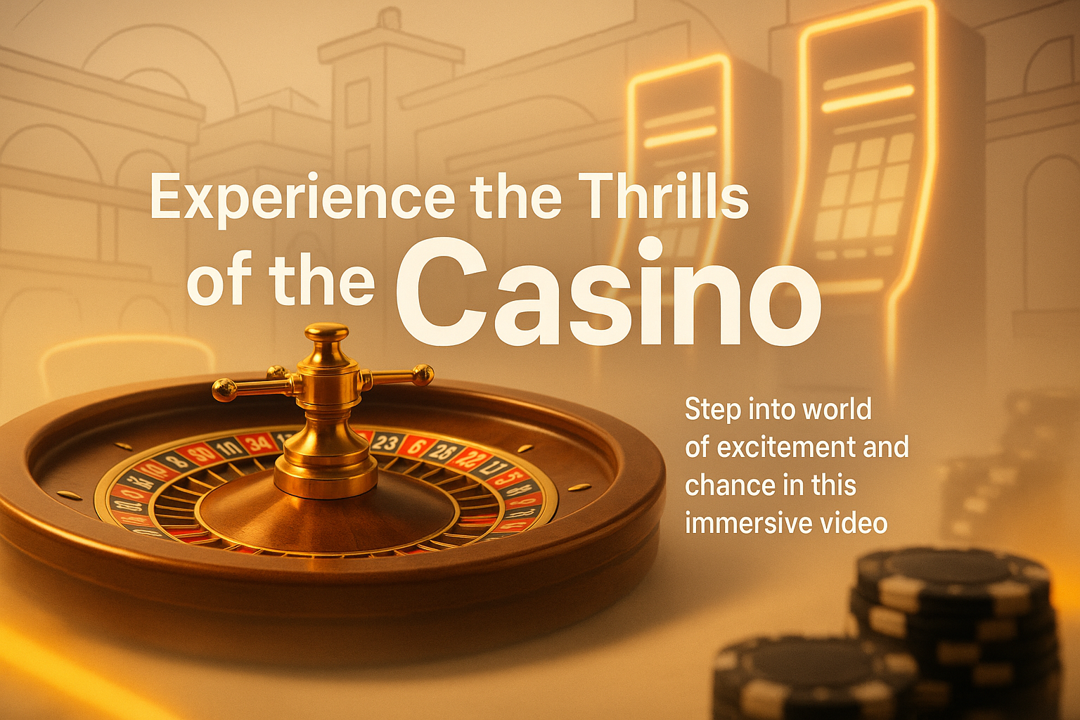 Engaging promotional graphic featuring a roulette wheel and casino elements, designed to attract viewers to an immersive video experience about casinos.