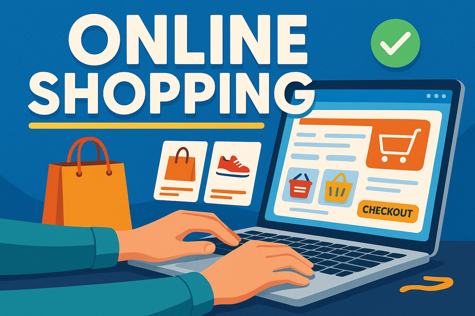 Illustration of Online Shopping Experience with Laptop and Shopping Bags