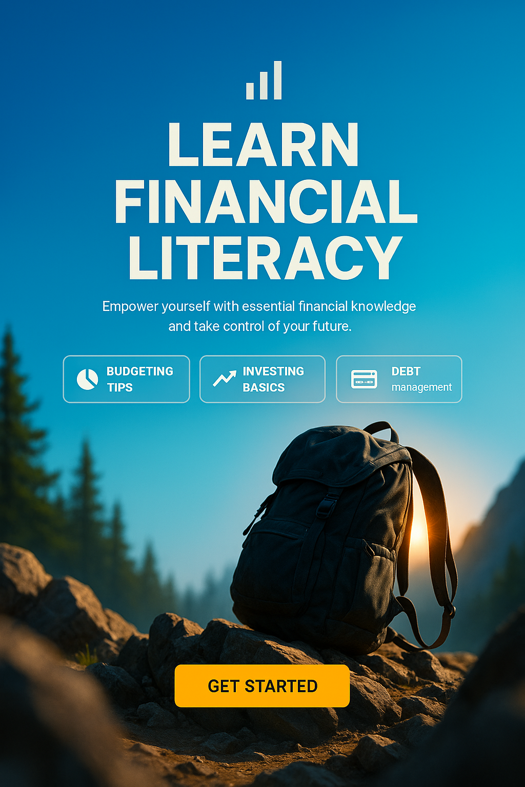 /Collection: /by davooda/Type: PNG/This vibrant social media post promotes financial literacy with an inviting design. It features a scenic background and a backpack, appealing to those seeking knowledge on budgeting and investing.