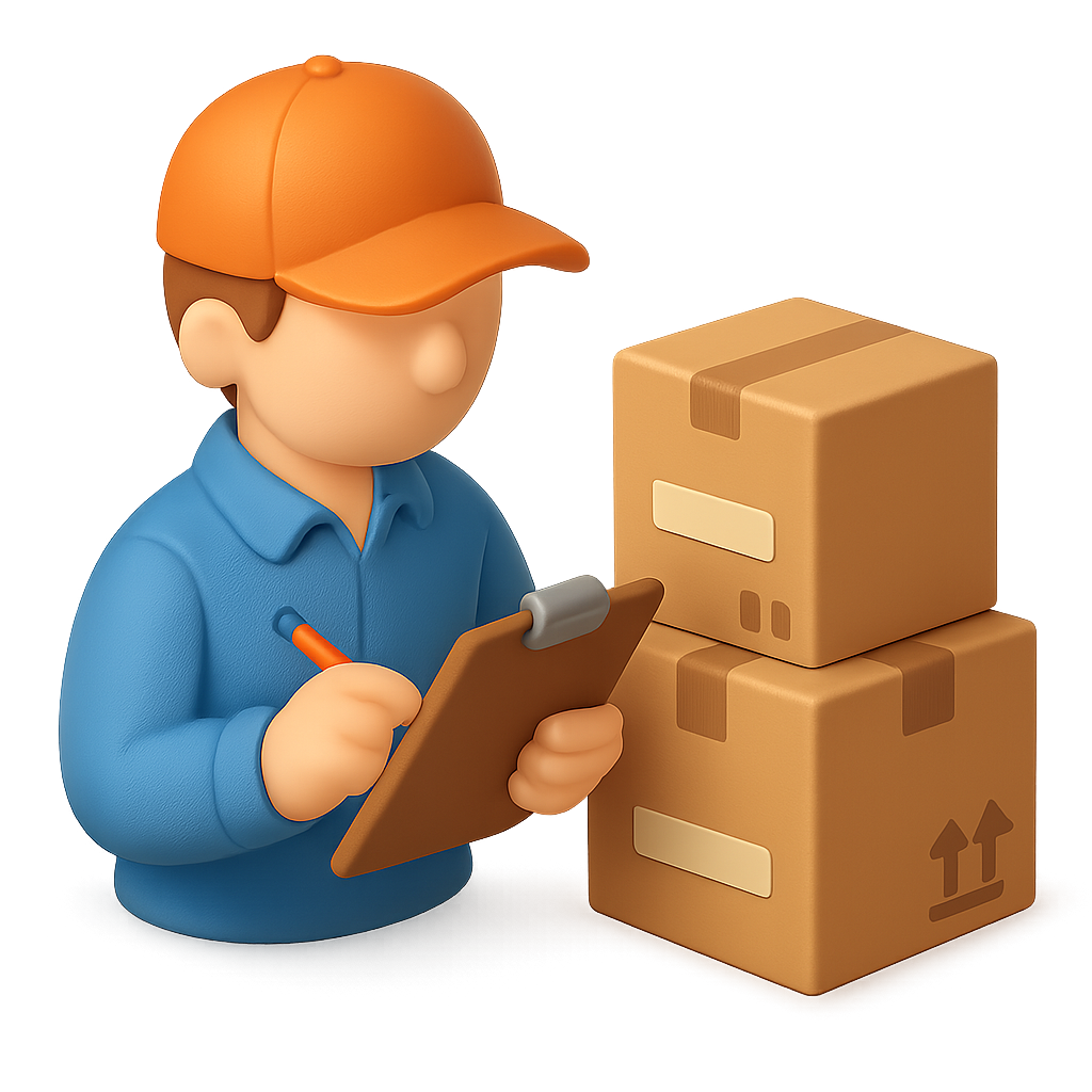 /Collection: /by davooda/Type: PNG/A three-dimensional icon depicting an inventory manager in a blue shirt and orange cap, holding a clipboard and standing next to stacked cardboard boxes, all with a volumetric, isometric design.
