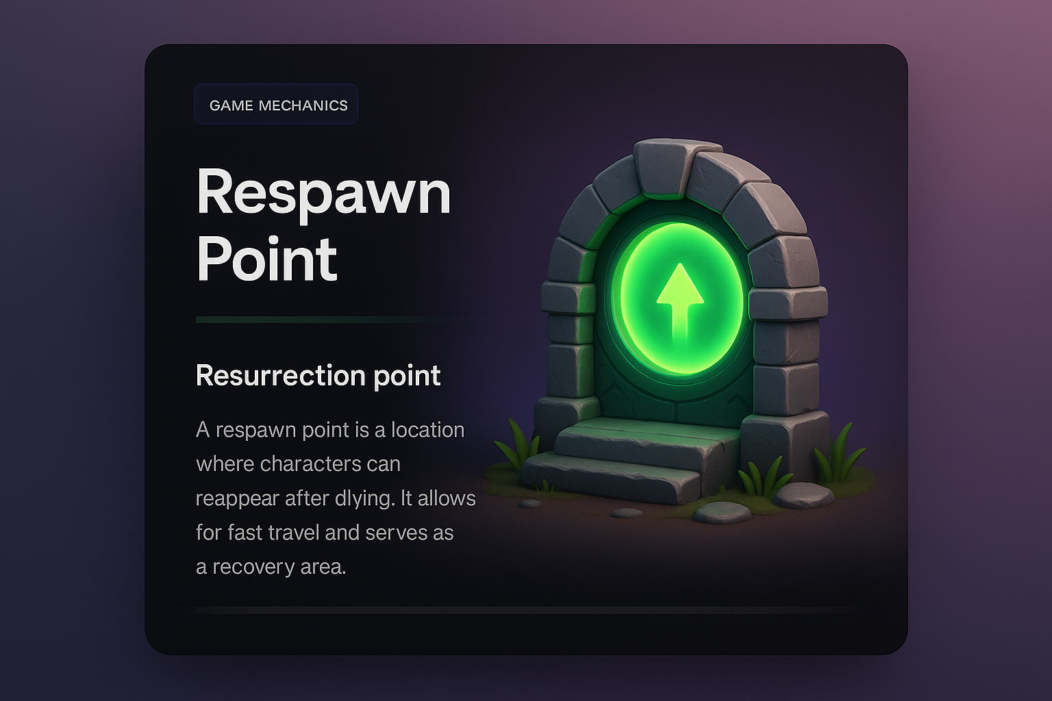A vibrant 3D illustration showcasing a respawn point with a glowing green arrow. The design features a dark gradient background and a structured stone arch, emphasizing game mechanics.