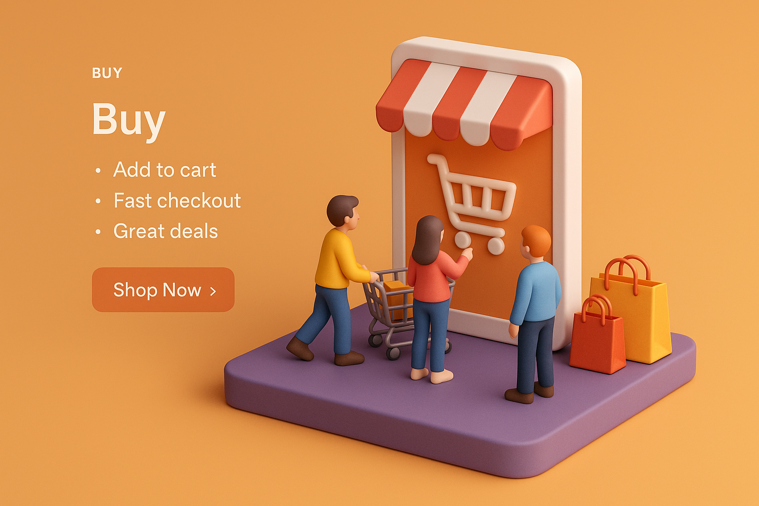 /Collection: /by davooda/Type: PNG/A colorful 3D scene depicting small characters engaging in shopping activities. The composition emphasizes a zoomed-out view, showcasing a cart, bags, and a checkout interface.
