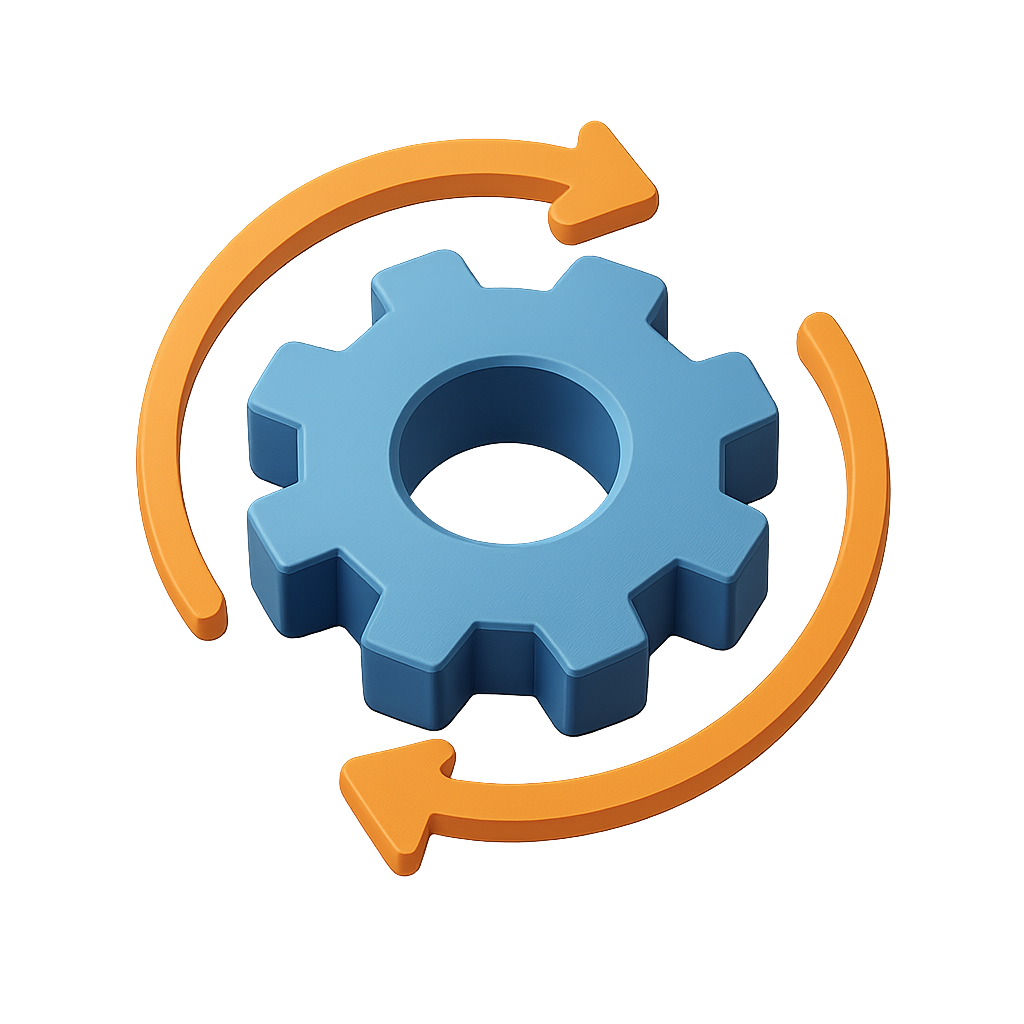 /Collection: /by davooda/Type: PNG/A visually appealing 3D gear icon with a blue color, featuring orange arrows that suggest rotational movement. The design is isometric with a transparent background, creating a modern and dynamic look.