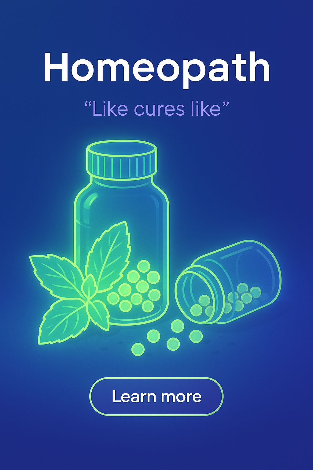 /Collection: /by davooda/Type: PNG/A captivating homeopathy scene featuring glowing bottles and herbal elements, set against a vibrant blue background. The composition highlights the phrase 'Homeopath' with a soft inner glow.