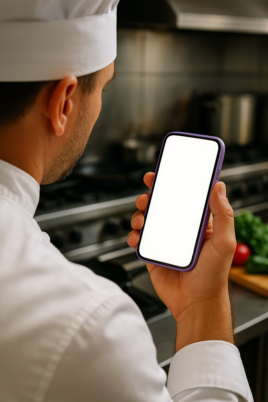 A chef in a white uniform and hat is seen from behind, holding a purple phone with a blank screen in a kitchen filled with cooking equipment. The scene captures a dynamic moment.