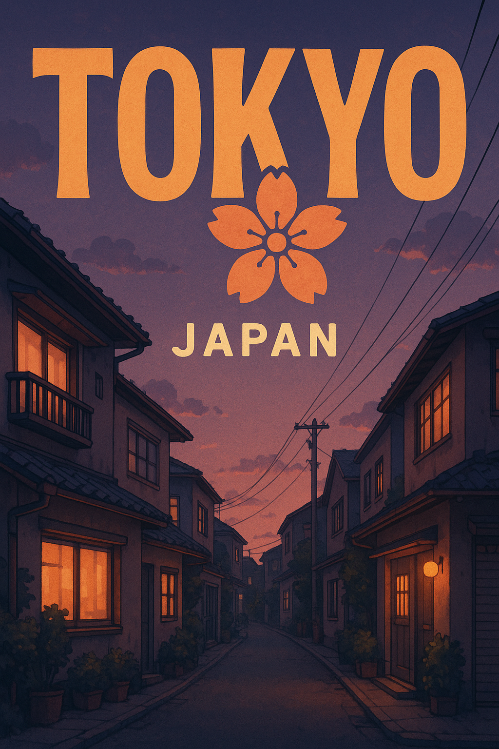 /Collection: /by davooda/Type: PNG/Stylized travel poster depicting a serene Tokyo street scene at dusk, featuring cherry blossom motifs and warm lighting, ideal for promoting tourism or cultural events.