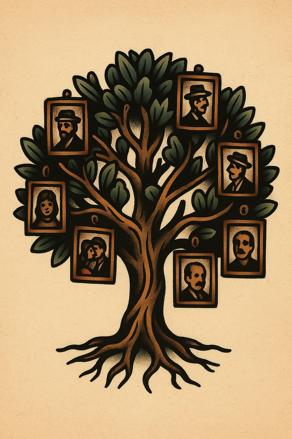 An artistic tattoo design featuring a tree with photographs as leaves, showcasing various portraits. The background is a subtle beige, enhancing the illustrations.