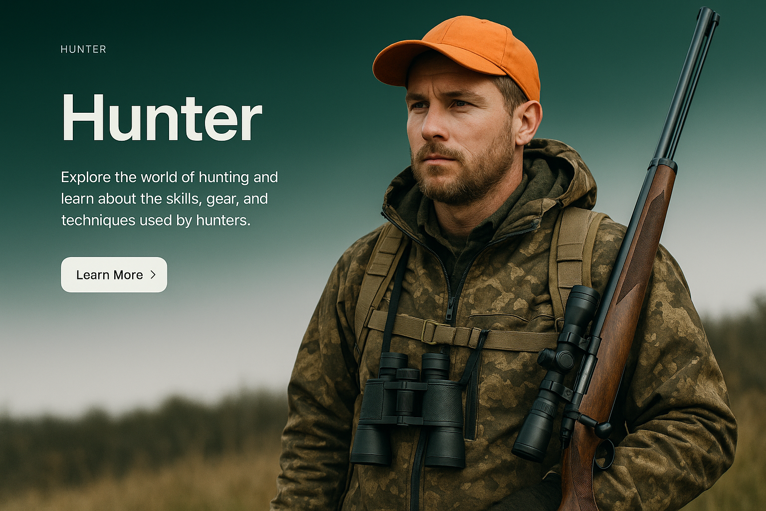 A modern web page design featuring a hunter in a realistic setting, showcasing key elements like a title, text block, and action button. The background transitions from a dark gradient to white.