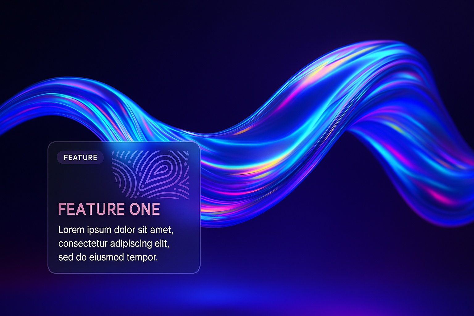 /Collection: /by davooda/Type: PNG/A dynamic 3D render of iridescent neon waves set against a dark background. Features a block for text and graphics, ideal for web design showcasing various features.