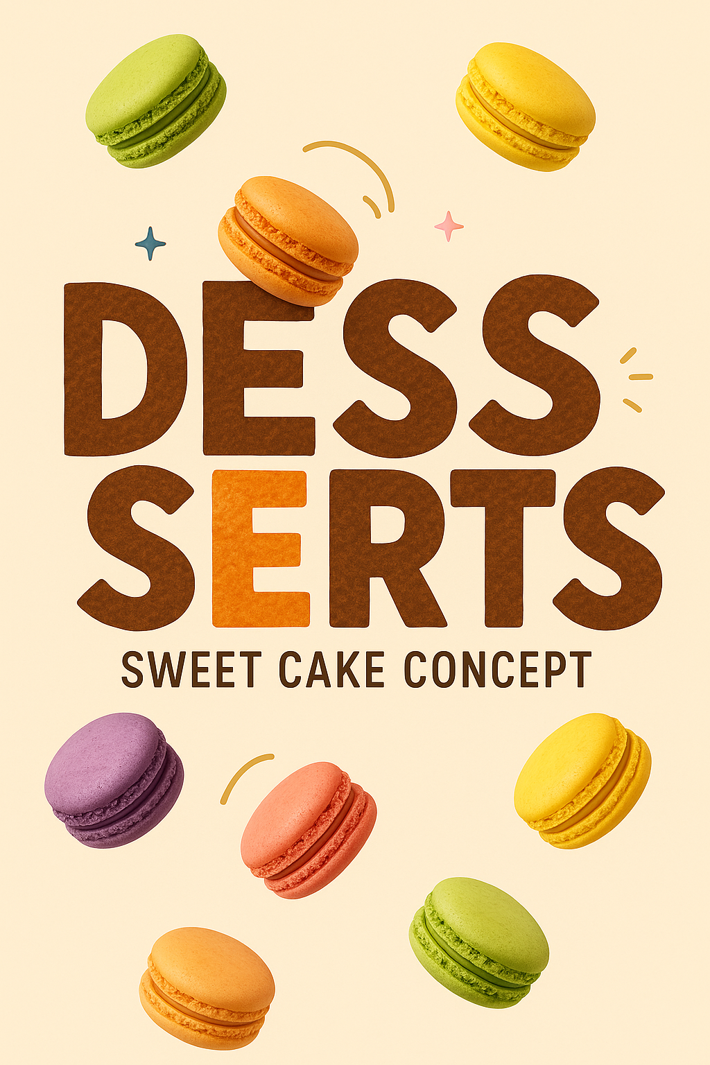 Vibrant dessert concept graphic showcasing macarons with playful typography. Ideal for bakery promotions or dessert-related marketing materials.