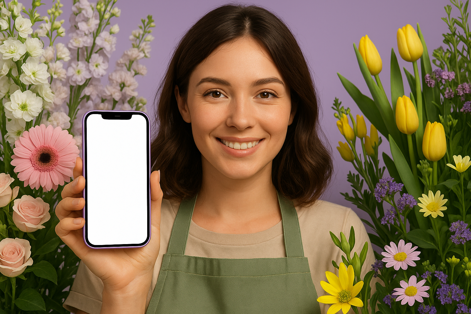 A smiling female florist stands amidst a vibrant array of flowers, holding a phone with a blank screen. The background features a soft purple hue, enhancing the floral display.
