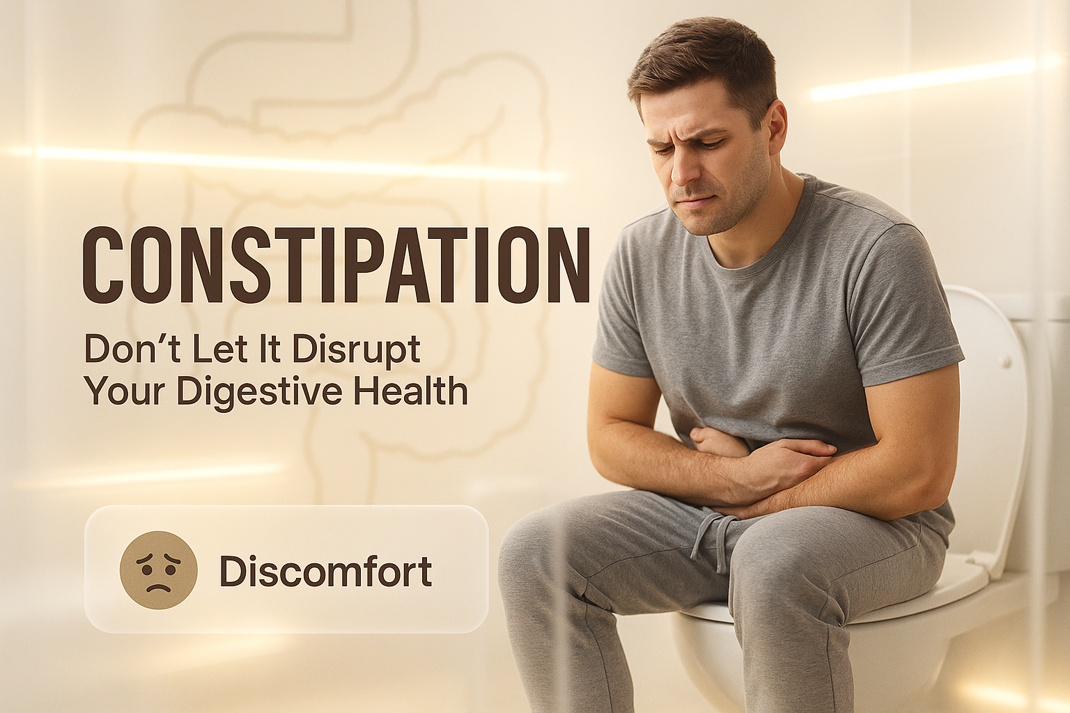 Informative graphic addressing constipation, featuring a concerned individual on a toilet. Designed for health awareness campaigns, it emphasizes digestive health.