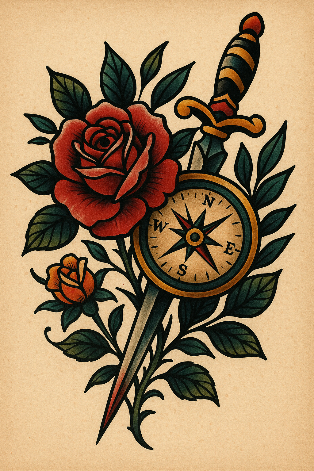 Bold tattoo design featuring a rose and dagger illustration