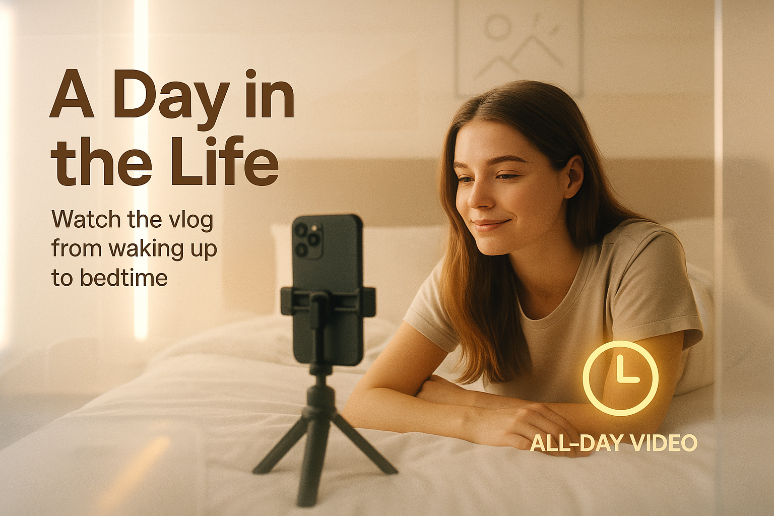 Engaging promotional image for a lifestyle vlog showcasing a content creator filming on a smartphone. The warm tones and relaxed setting appeal to a young audience interested in daily life vlogs.