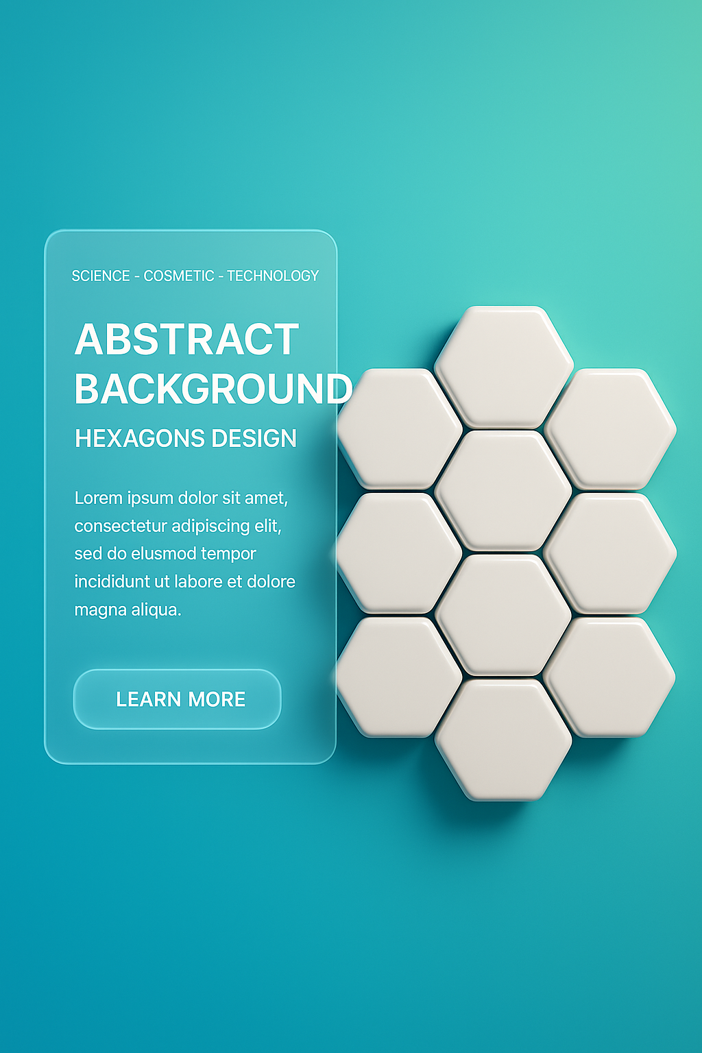 /Collection: /by davooda/Type: PNG/An abstract skincare promotion featuring hexagonal shapes on a vibrant gradient background. The design includes glass panels with a frosted blur effect and a glowing button for user engagement.