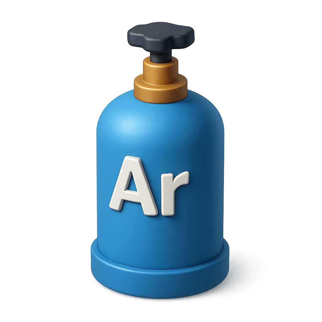 A stylized 3D representation of an argon gas cylinder, featuring a blue body, golden valve, and 'Ar' label. The icon is designed with a transparent background and a volumetric effect.