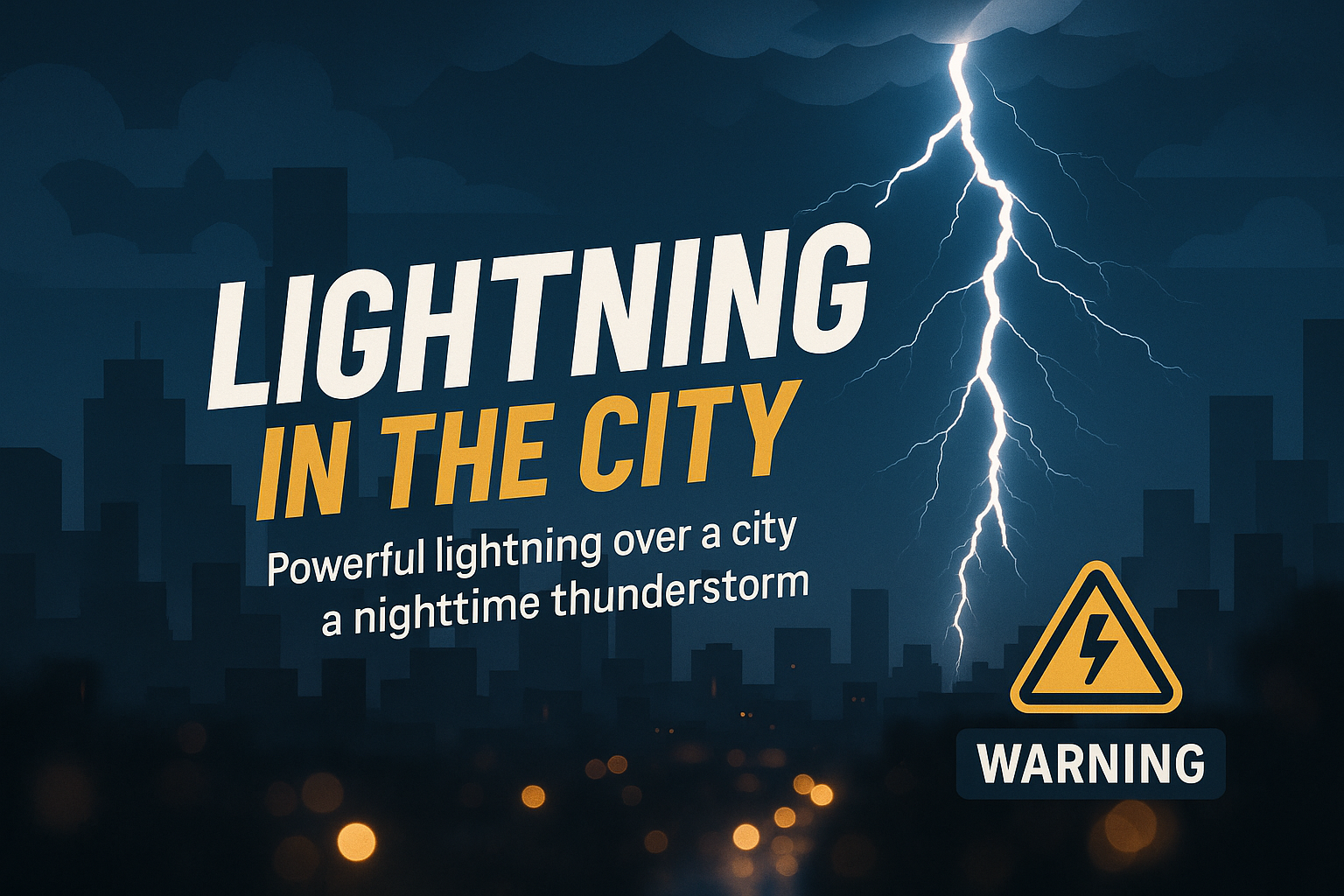 Dramatic Weather Alert Graphic Featuring Lightning in Cityscape