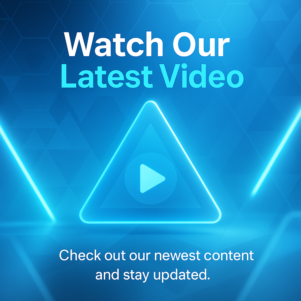 /Collection: /by davooda/Type: PNG/A vibrant neon geometric background featuring a glowing triangle play button. The design includes layered text elements promoting the latest video, surrounded by a luminous blue ambiance.