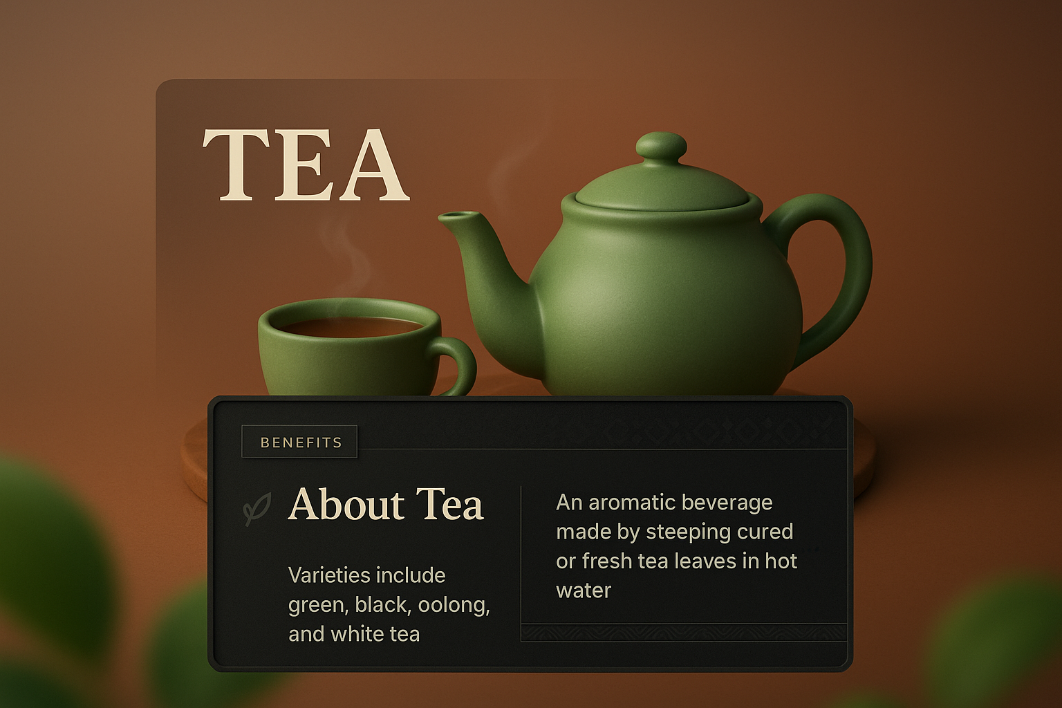 /Collection: /by davooda/Type: PNG/A beautifully crafted 3D illustration of a teapot and cup, featuring a dark overlay with text about tea benefits. The background has a smooth gradient, enhancing the visual appeal.