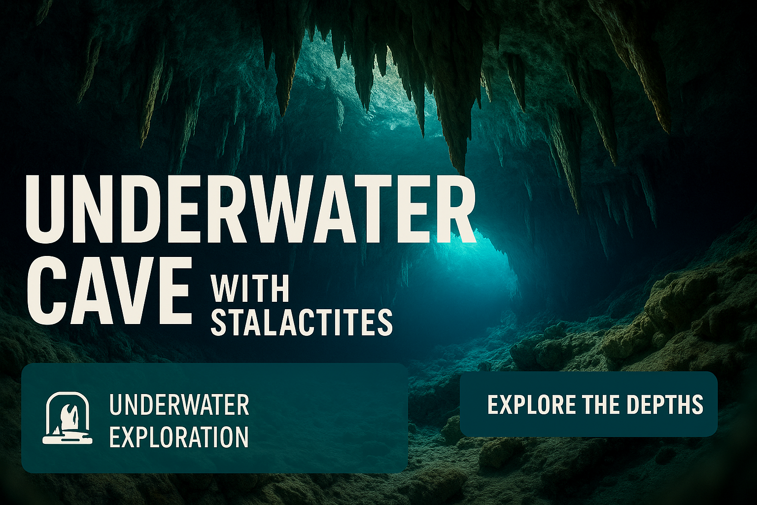 A visually striking underwater cave scene featuring stalactites, designed for promotional purposes. Ideal for adventure tourism or exploration-themed content.