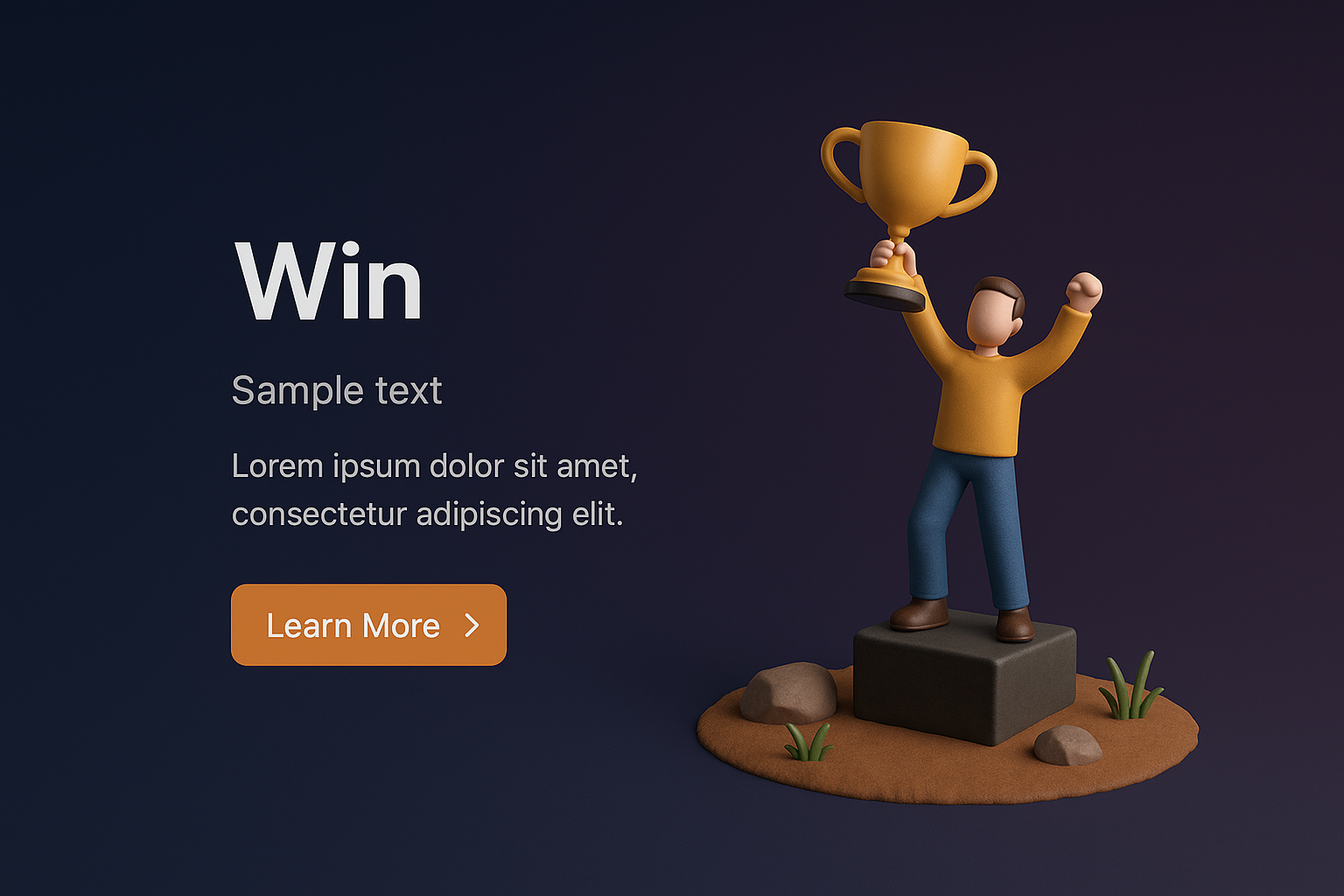 A vibrant 3D scene showing a character celebrating a victory with a trophy, set against a dark gradient background. The design features a small text block and call-to-action button.