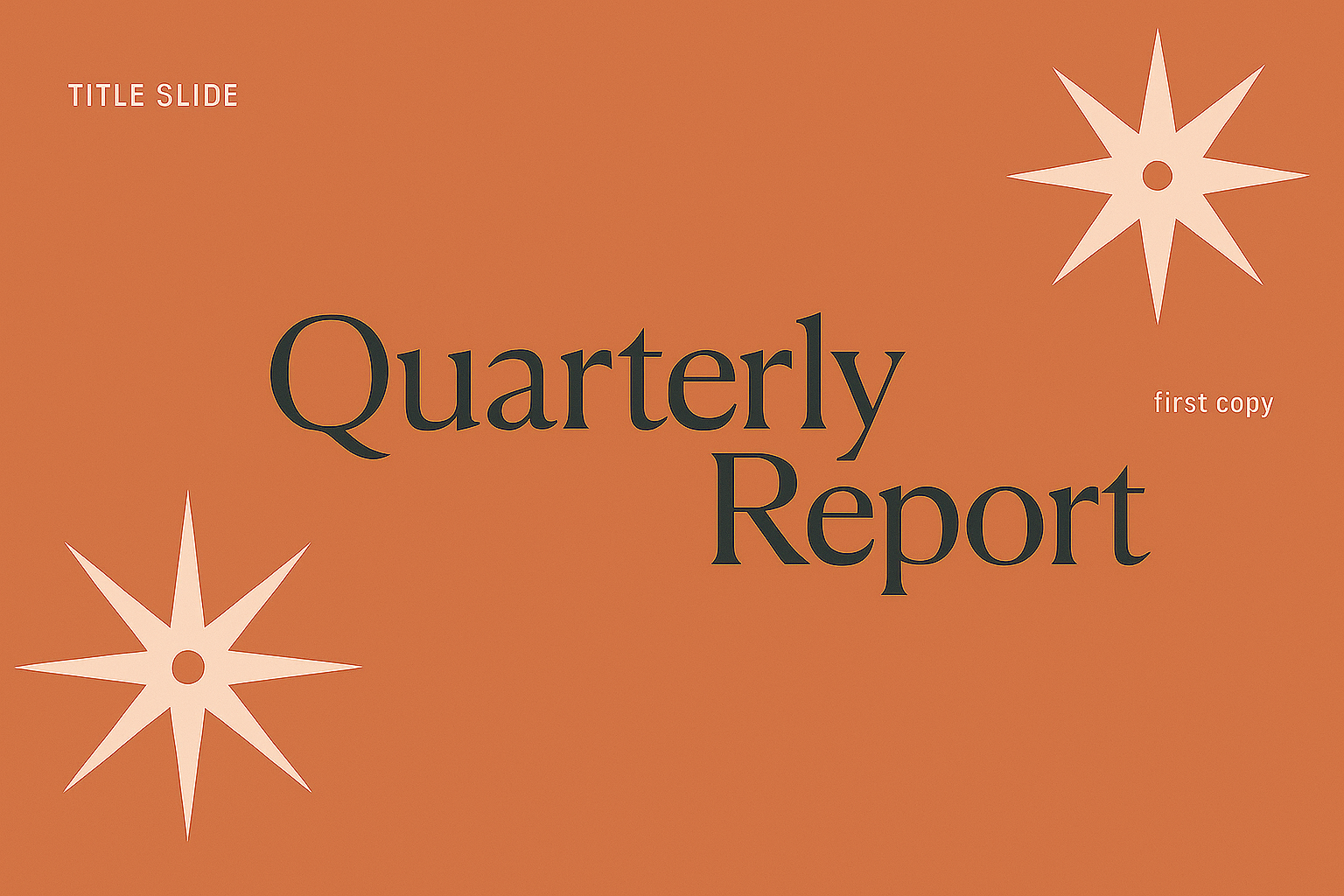 A visually appealing title slide for a quarterly report featuring a warm orange background, bold typography, and decorative star motifs in contrasting colors.