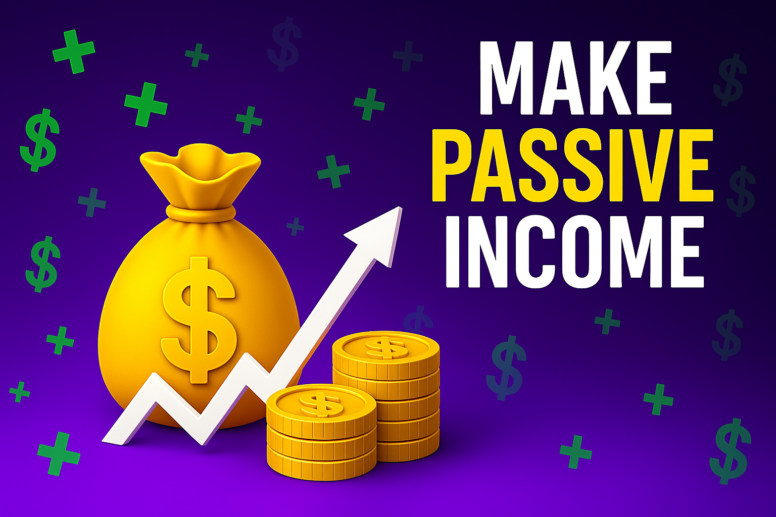 /Collection: /by davooda/Type: PNG/Vibrant digital illustration representing the concept of passive income with a money bag, coins, and an upward trend arrow, suitable for financial blogs or marketing materials.
