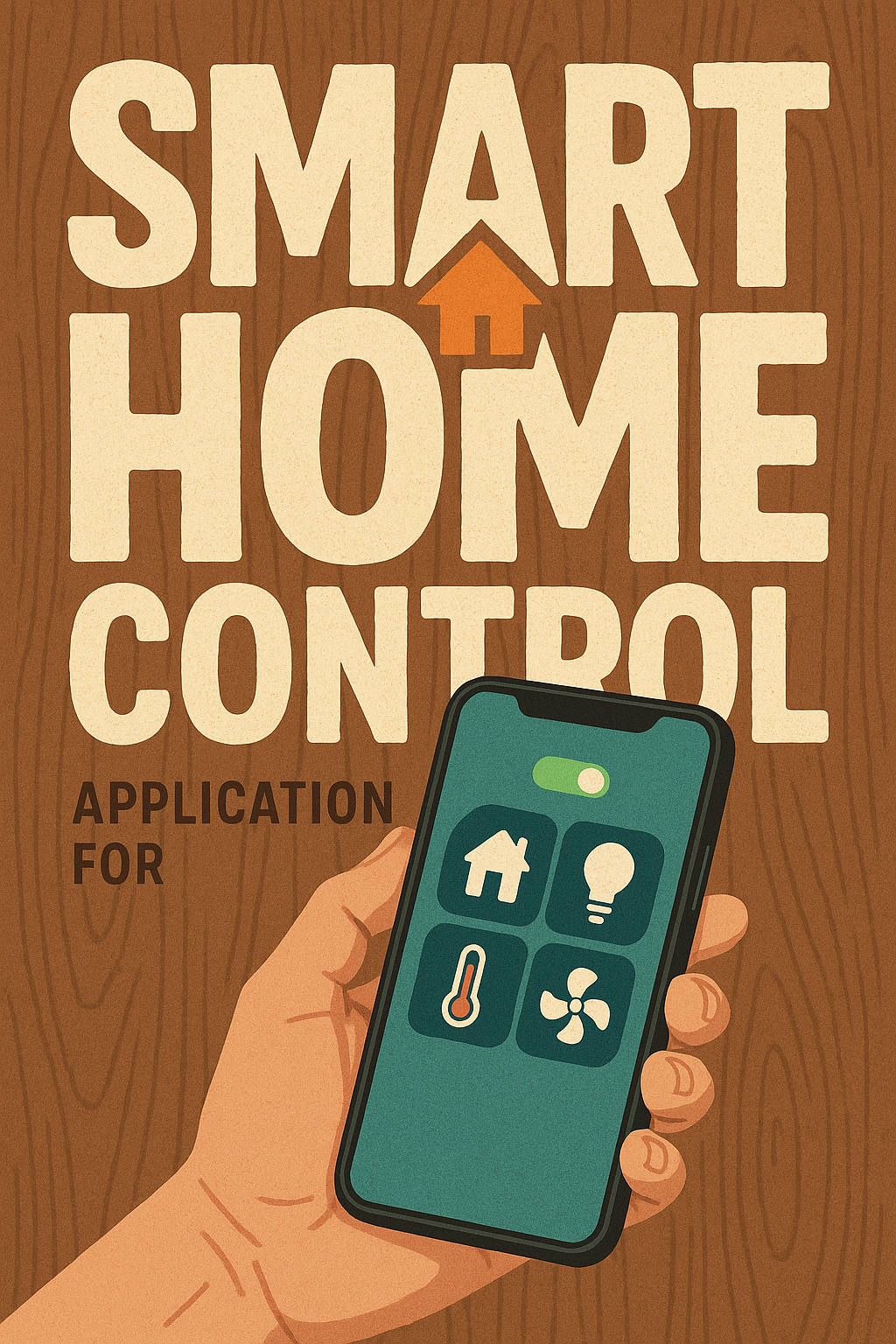 Illustrative graphic showcasing a smartphone displaying smart home controls, ideal for promoting home automation applications with a warm, vintage aesthetic.