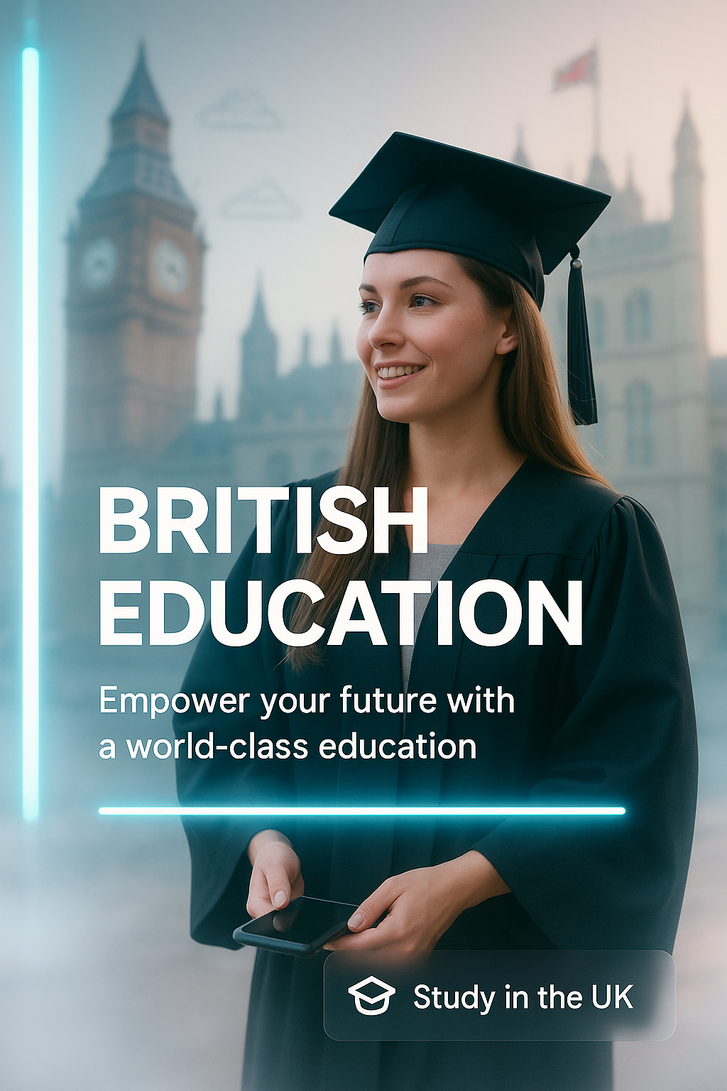 /Collection: /by davooda/Type: PNG/Engaging promotional image showcasing a graduate in a cap and gown, symbolizing British education. Ideal for educational institutions targeting international students.