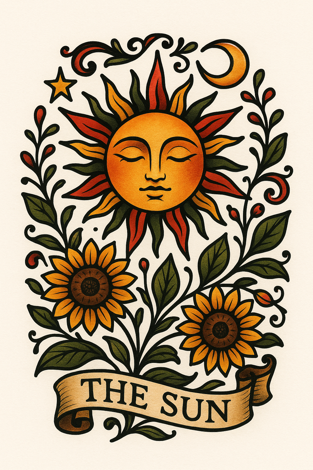 A colorful artistic illustration featuring a stylized sun surrounded by sunflowers and decorative foliage, ideal for decorative art and print.