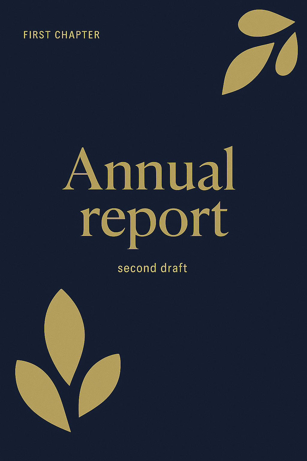 An elegantly designed annual report cover featuring a dark blue background with gold accents. The title 'Annual Report' is prominently displayed, accompanied by decorative leaf motifs.