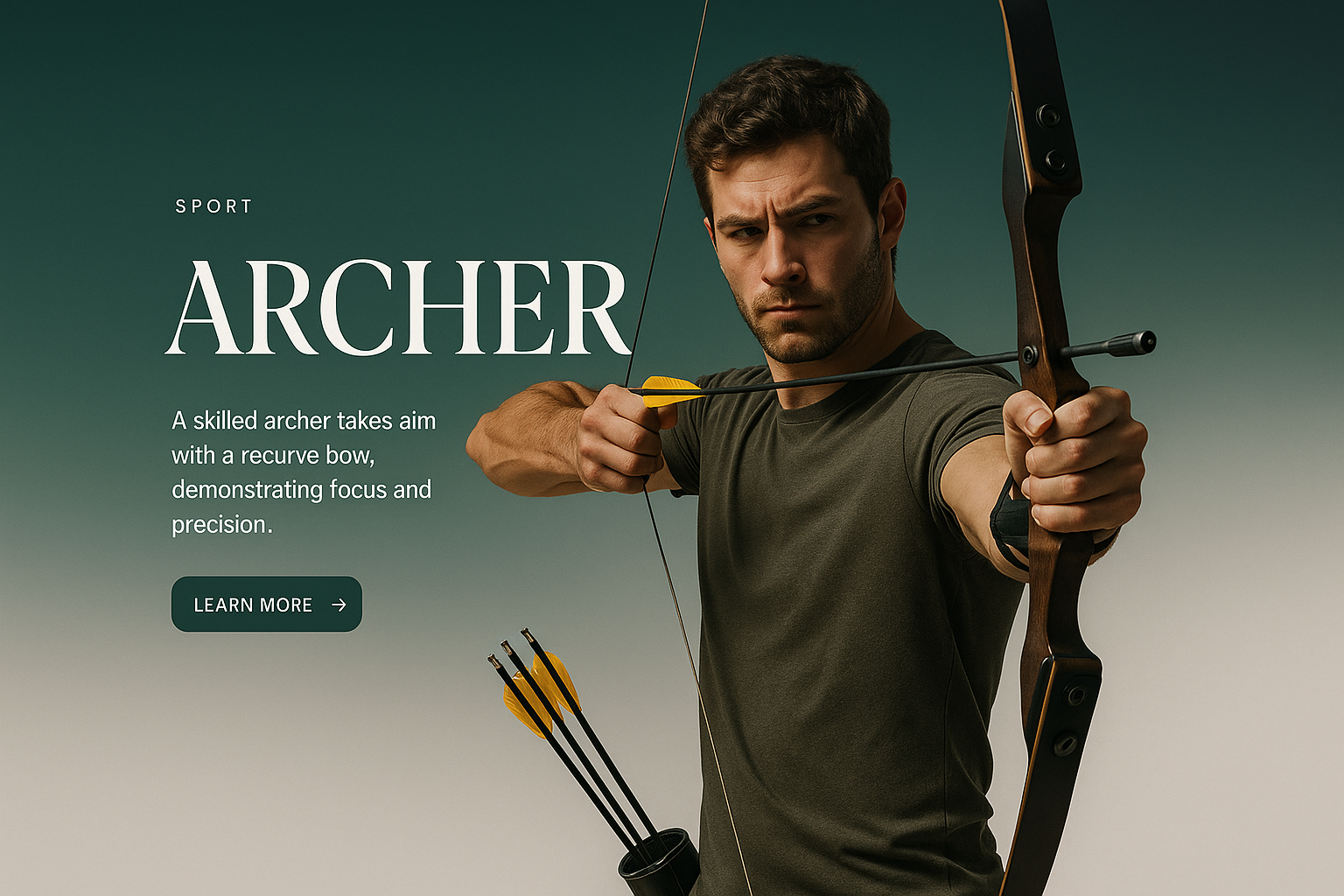 A focused archer aims with a recurve bow, showcasing precision. The background features a gradient from dark to white, with informative text and a call-to-action button.