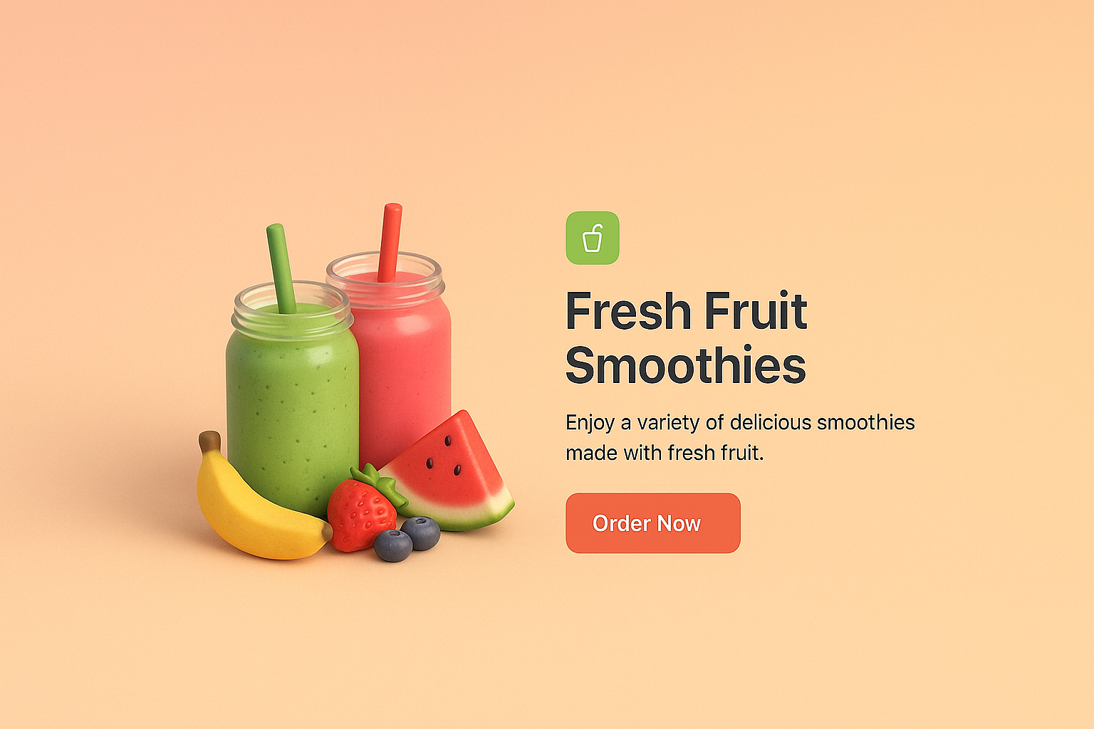 A visually appealing 3D scene featuring vibrant fruit smoothies in jars, surrounded by fresh fruits like bananas and berries. The background has a smooth gradient.