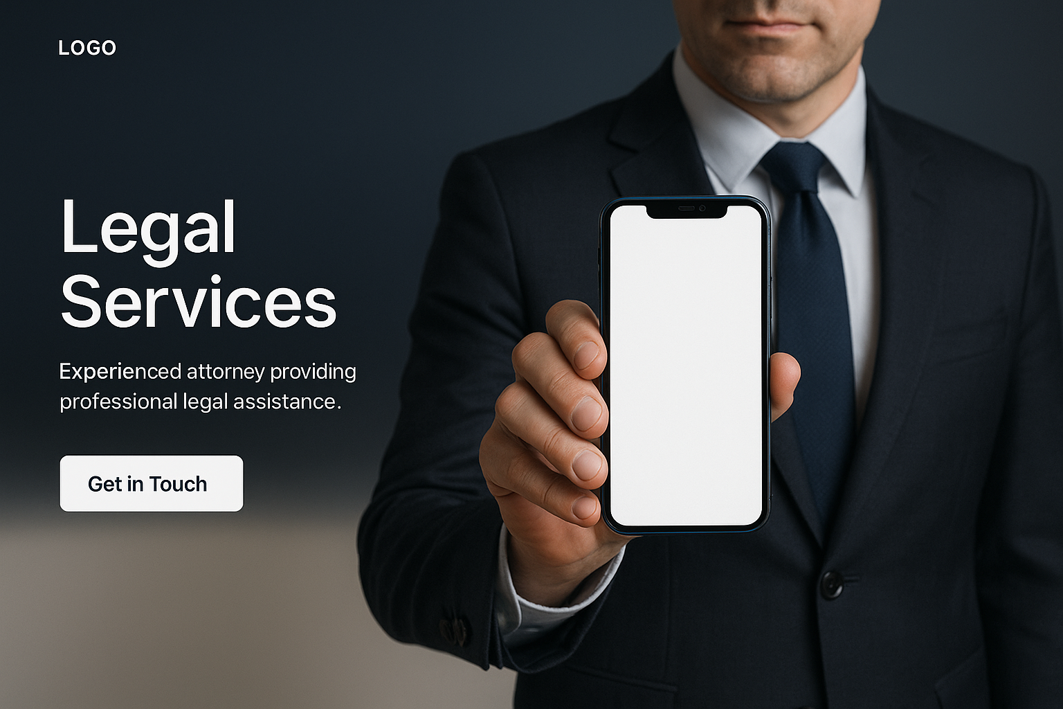 A well-dressed attorney holds a smartphone displaying a blank screen, symbolizing legal services. The professional setting emphasizes trust and expertise.