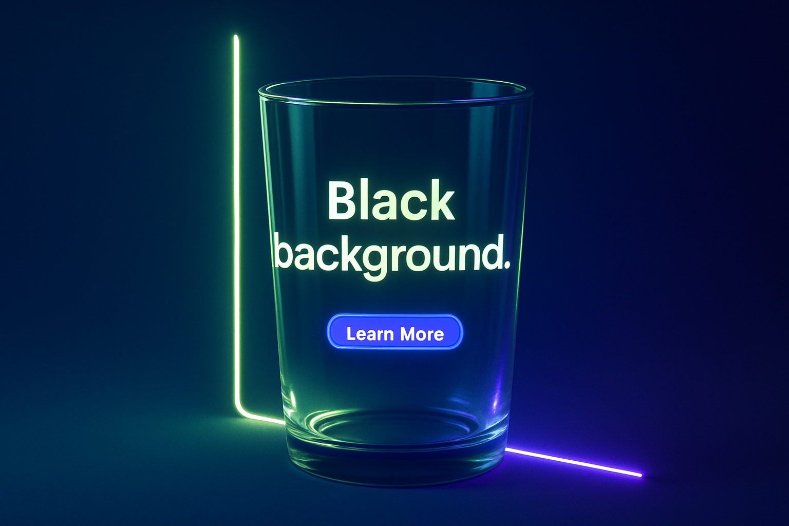 A semi-transparent glass with a neon glow effect against a solid blue background. Glowing lines in yellow-green and violet highlight the edges, adding depth and atmosphere.