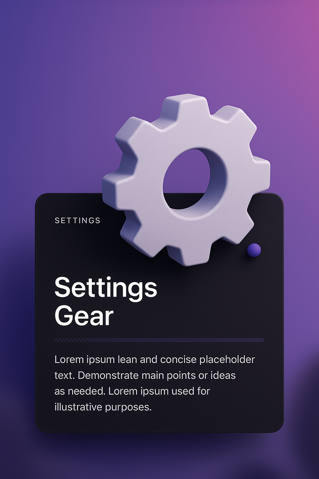 A 3D illustration of a settings gear on a dark background, integrated with a text block that features a title and placeholder text, creating a cohesive web design element.