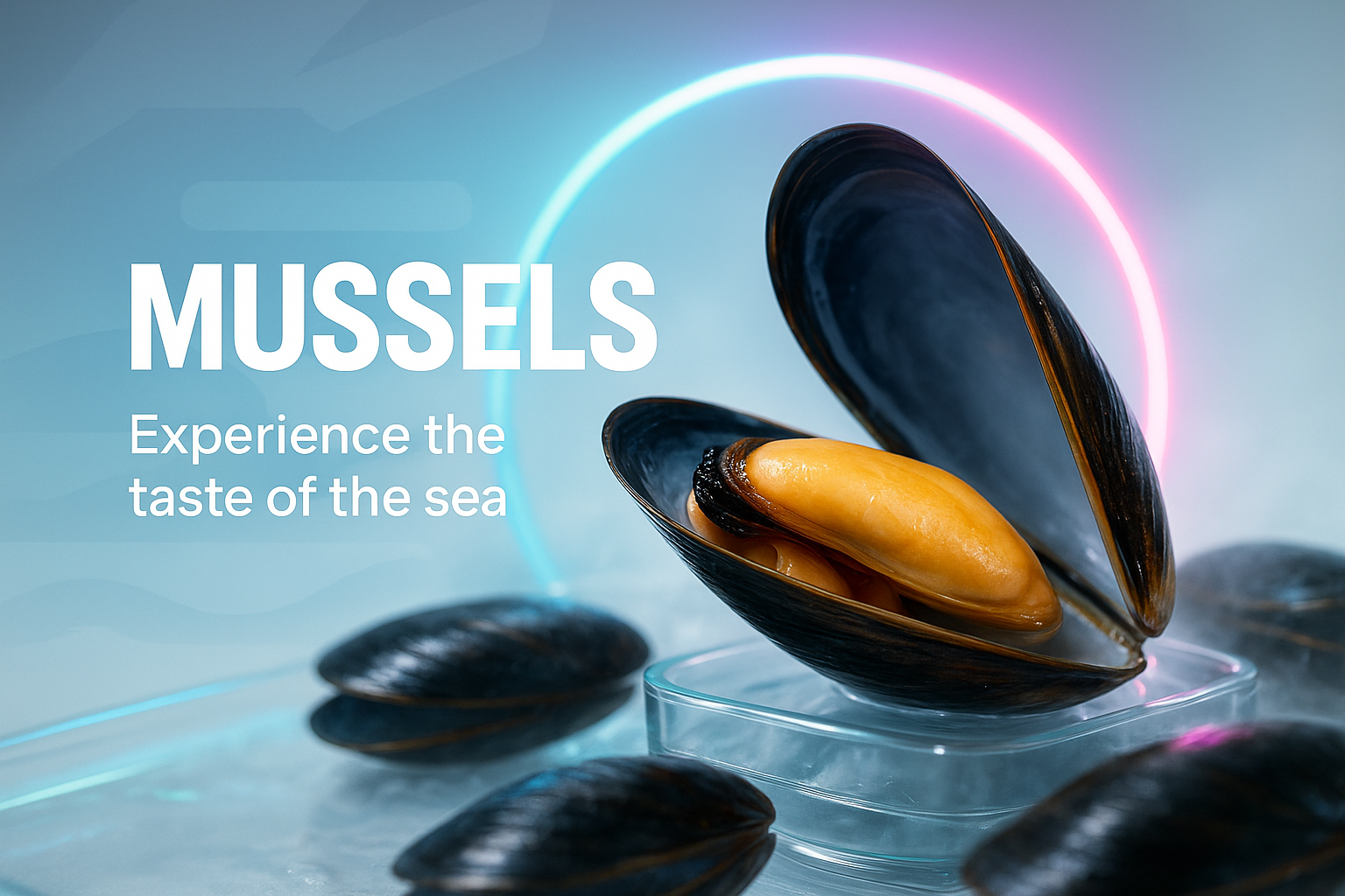 High-quality food photography showcasing fresh mussels in a modern, appealing style. Ideal for culinary promotions or seafood marketing.